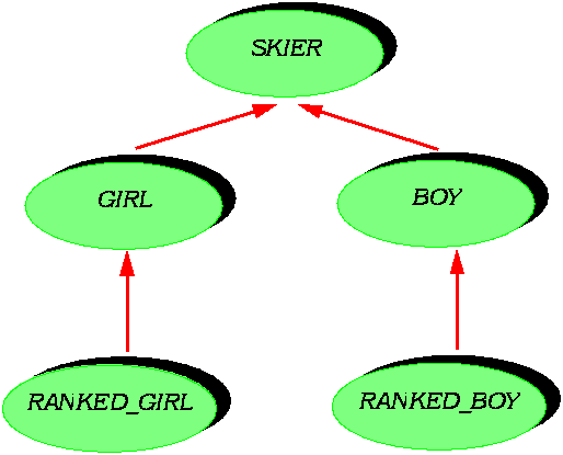 Ideally, a presentation of typing should stop here. Unfortunately, the combination of static typing with other requirements of the object-oriented method makes the issues more difficult than they appear at first. To accompany the discussion it will be convenient to use the example hierarchy shown below, applying to a high-school ski team preparing for a trip to a minor-league championship. For brevity and simplicity we use the class names GIRL as an abbreviation for "member of the girls' ski team" and BOY as an abbreviation for "member of the boys' ski team". Some skiers in each team are ranked, that is to say have already recorded good results in earlier championships. This is an important notion: ranked skiers will start first in a slalom, giving them a considerable advantage over the others; after too many competitors have used it, the run is much harder to negotiate. (This rule that ranked skiers go first is a way to privilege the already privileged, and may explain why skiing holds such a fascination over the minds of many people: that it serves as an apt metaphor for life itself.) This yields two new classes, RANKED_GIRL and RANKED_BOY. I hope this example will provide a welcome relief from the omnivores and herbivores that have for too long grazed the wild pastures of such Usenet forums as comp.object.