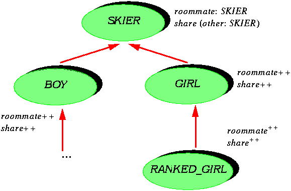 class GIRL inherit SKIER redefine roommate end feature roommate: GIRL; -- This skier's roommate ... end -- class GIRL