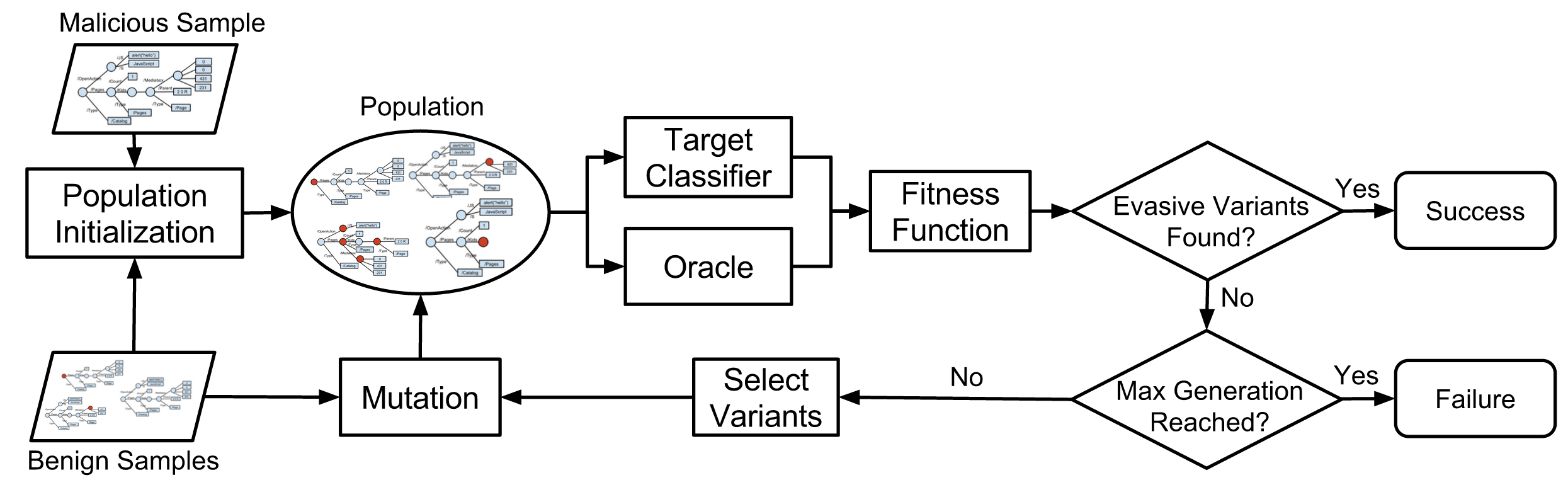 Machine learning is widely used to develop classifiers for security tasks. However, the robustness of these methods against motivated adversaries is uncertain. In this work, we propose a generic method to evaluate the robustness of classifiers under attack. The key idea is to stochastically manipulate a malicious sample to find a variant that preserves the malicious behavior but is classified as benign by the classifier. We present a general approach to search for evasive variants and report on results from experiments using our techniques against two PDF malware classifiers, PDFrate and Hidost. Our method is able to automatically find evasive variants for both classifiers for all of the 500 malicious seeds in our study. Our results suggest a general method for evaluating classifiers used in security applications, and raise serious doubts about the effectiveness of classifiers based on superficial features in the presence of adversaries.